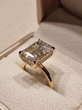 I have purchased this ring as a gift for my wife, the assistance received in customising the ring was utterly professional. The result is a perfectly sized ring with the desired engraving placed in the inner ring, with an immaculate 10 ct Moissanite emerald cut VVS1 D colour stone set on a 4 clasp 18K yellow gold setting, the halo is also with Moissanite stones brilliant cut of the abovementioned quality, all certified. The craftsmanship is simply exquisite and flawless. I congratulate the vendor in having met my expectations, my wife is indeed delighted. Thank you.