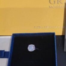 The ring is lovely. Really sparkly. Comes with a certificate and warranty card. Very impressed to be honest. Looks the business. If it is real Moisannite it’s a bargain!! Took about 7 weeks to come to the UK.