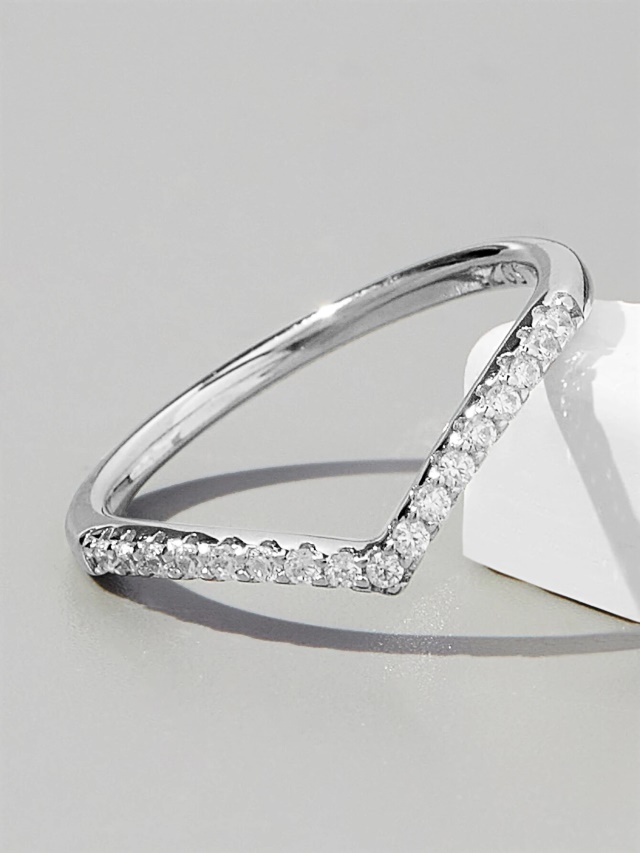 (Above showcasing the ‘Chevonne’ Moissanite Chevron Eternity Band)