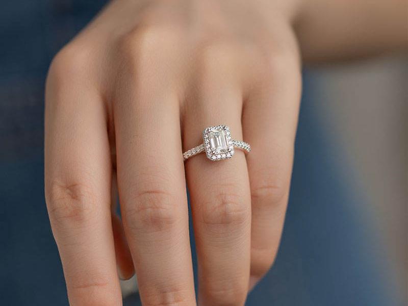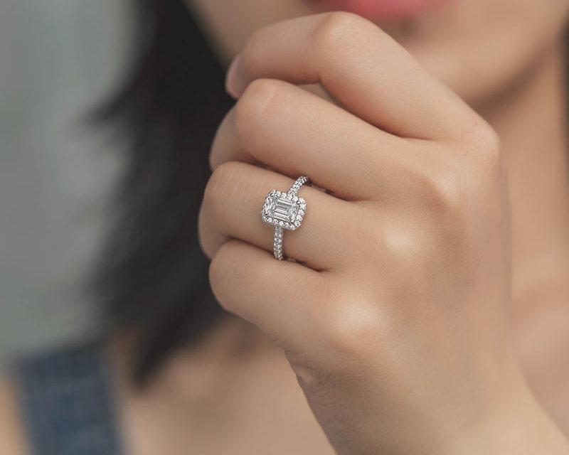 (Above showcasing the ‘Emery’ 2 carat Moissanite Emerald Cut Halo Ring – shown on 5 US ring size model)