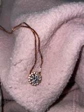 (Above showcasing the 1 carat Moissanite Flower Halo pendant + necklace in white gold metal color)