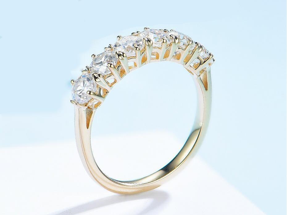 (Above showcasing the ‘Olivette’ Old European Cut Moissanite Eternity Wedder Ring in Yellow Gold)