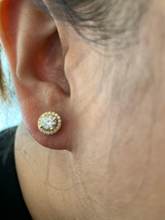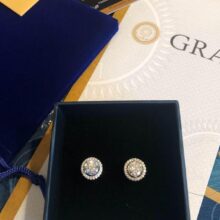 (Above showcasing the ‘Rosemary’ Round Halo Stud Earrings in various carat sizes + gold colors)