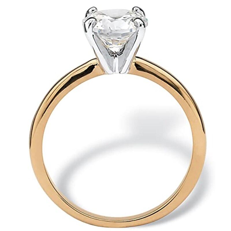 (Above showcasing the ‘Britney’ Round Moissanite 4 Prong Solitaire Ring in Two Tone White & Yellow Gold)